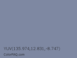 YUV 135.974,12.831,-8.747 Color is a normal blue color and the nearest color is Shadow Blue #778ba5. Hex code #7e88a2 and RGB value is rgb(126,136,162). In RGB color space, this color is composed of 49% red, 53% green, 64% blue, In CMYK color space, this color is composed of 22% cyan, 16% magenta, 0% yellow , 36% black , In HSL color space, this color has a hue angle of 223° , 16% saturation and 56% lightness.