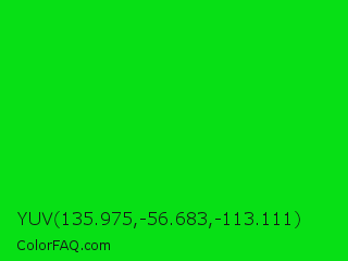 YUV 135.975,-56.683,-113.111 Color is a normal green color and the nearest color is Vivid Malachite #00cc33. Hex code #07e015 and RGB value is rgb(7,224,21). In RGB color space, this color is composed of 3% red, 88% green, 8% blue, In CMYK color space, this color is composed of 97% cyan, 0% magenta, 91% yellow , 12% black , In HSL color space, this color has a hue angle of 124° , 94% saturation and 45% lightness.