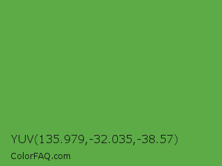 YUV 135.979,-32.035,-38.57 Color is a normal green color and the nearest color is Apple #4fa83d. Hex code #5cab47 and RGB value is rgb(92,171,71). In RGB color space, this color is composed of 36% red, 67% green, 28% blue, In CMYK color space, this color is composed of 46% cyan, 0% magenta, 58% yellow , 33% black , In HSL color space, this color has a hue angle of 107° , 41% saturation and 47% lightness.