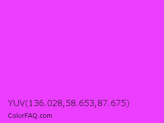 YUV 136.028,58.653,87.675 Color is a light magenta color and the nearest color is Purple Pizzazz #fe4eda. Hex code #ec3eff and RGB value is rgb(236,62,255). In RGB color space, this color is composed of 93% red, 24% green, 100% blue, In CMYK color space, this color is composed of 7% cyan, 76% magenta, 0% yellow , 0% black , In HSL color space, this color has a hue angle of 294° , 100% saturation and 62% lightness.