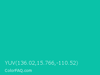 YUV 136.02,15.766,-110.52 Color is a normal cyan color and the nearest color is Amazonite #00c4b0. Hex code #0ac2a8 and RGB value is rgb(10,194,168). In RGB color space, this color is composed of 4% red, 76% green, 66% blue, In CMYK color space, this color is composed of 95% cyan, 0% magenta, 13% yellow , 24% black , In HSL color space, this color has a hue angle of 172° , 90% saturation and 40% lightness.