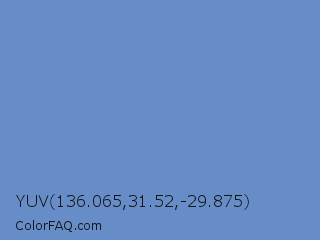 YUV 136.065,31.52,-29.875 Color is a normal blue color and the nearest color is Danube #6093d1. Hex code #668dc8 and RGB value is rgb(102,141,200). In RGB color space, this color is composed of 40% red, 55% green, 78% blue, In CMYK color space, this color is composed of 49% cyan, 30% magenta, 0% yellow , 22% black , In HSL color space, this color has a hue angle of 216° , 47% saturation and 59% lightness.
