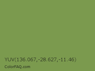 YUV 136.067,-28.627,-11.46 Color is a normal green color and the nearest color is Asparagus Green #7ba05b. Hex code #7b9a4e and RGB value is rgb(123,154,78). In RGB color space, this color is composed of 48% red, 60% green, 31% blue, In CMYK color space, this color is composed of 20% cyan, 0% magenta, 49% yellow , 40% black , In HSL color space, this color has a hue angle of 84° , 33% saturation and 45% lightness.
