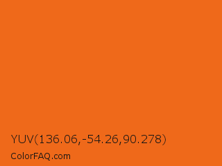 YUV 136.06,-54.26,90.278 Color is a normal orange color and the nearest color is Vivid Vermilion #e56024. Hex code #ef691a and RGB value is rgb(239,105,26). In RGB color space, this color is composed of 94% red, 41% green, 10% blue, In CMYK color space, this color is composed of 0% cyan, 56% magenta, 89% yellow , 6% black , In HSL color space, this color has a hue angle of 22° , 87% saturation and 52% lightness.
