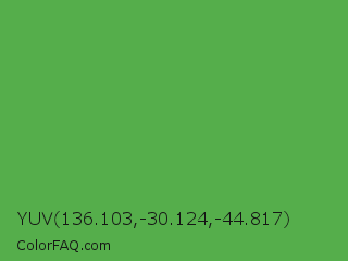 YUV 136.103,-30.124,-44.817 Color is a normal green color and the nearest color is Apple #4fa83d. Hex code #55ae4b and RGB value is rgb(85,174,75). In RGB color space, this color is composed of 33% red, 68% green, 29% blue, In CMYK color space, this color is composed of 51% cyan, 0% magenta, 57% yellow , 32% black , In HSL color space, this color has a hue angle of 114° , 40% saturation and 49% lightness.