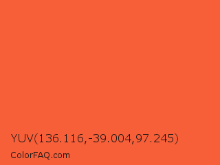 YUV 136.116,-39.004,97.245 Color is a normal red color and the nearest color is Orange Soda #fa5b3d. Hex code #f75f39 and RGB value is rgb(247,95,57). In RGB color space, this color is composed of 97% red, 37% green, 22% blue, In CMYK color space, this color is composed of 0% cyan, 62% magenta, 77% yellow , 3% black , In HSL color space, this color has a hue angle of 12° , 92% saturation and 60% lightness.