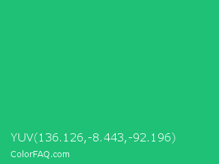YUV 136.126,-8.443,-92.196 Color is a normal green color and the nearest color is Mountain Meadow Crayola #1ab385. Hex code #1fc177 and RGB value is rgb(31,193,119). In RGB color space, this color is composed of 12% red, 76% green, 47% blue, In CMYK color space, this color is composed of 84% cyan, 0% magenta, 38% yellow , 24% black , In HSL color space, this color has a hue angle of 153° , 72% saturation and 44% lightness.