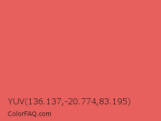 YUV 136.137,-20.774,83.195 Color is a light red color and the nearest color is Roman #de6360. Hex code #e7605e and RGB value is rgb(231,96,94). In RGB color space, this color is composed of 91% red, 38% green, 37% blue, In CMYK color space, this color is composed of 0% cyan, 58% magenta, 59% yellow , 9% black , In HSL color space, this color has a hue angle of 1° , 74% saturation and 64% lightness.