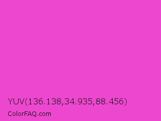 YUV 136.138,34.935,88.456 Color is a normal magenta color and the nearest color is Purple Pizzazz #fe4eda. Hex code #ed47cf and RGB value is rgb(237,71,207). In RGB color space, this color is composed of 93% red, 28% green, 81% blue, In CMYK color space, this color is composed of 0% cyan, 70% magenta, 13% yellow , 7% black , In HSL color space, this color has a hue angle of 311° , 82% saturation and 60% lightness.
