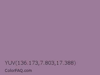 YUV 136.173,7.803,17.388 Color is a normal magenta color and the nearest color is Mountbatten Pink #997a8d. Hex code #9c7b98 and RGB value is rgb(156,123,152). In RGB color space, this color is composed of 61% red, 48% green, 60% blue, In CMYK color space, this color is composed of 0% cyan, 21% magenta, 3% yellow , 39% black , In HSL color space, this color has a hue angle of 307° , 14% saturation and 55% lightness.