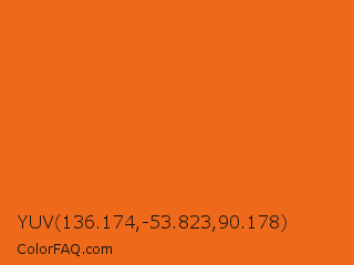 YUV 136.174,-53.823,90.178 Color is a normal orange color and the nearest color is Vivid Vermilion #e56024. Hex code #ef691b and RGB value is rgb(239,105,27). In RGB color space, this color is composed of 94% red, 41% green, 11% blue, In CMYK color space, this color is composed of 0% cyan, 56% magenta, 89% yellow , 6% black , In HSL color space, this color has a hue angle of 22° , 87% saturation and 52% lightness.
