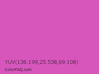 YUV 136.199,25.538,69.108 Color is a normal magenta color and the nearest color is Fuchsia Pink #c154c1. Hex code #d756bc and RGB value is rgb(215,86,188). In RGB color space, this color is composed of 84% red, 34% green, 74% blue, In CMYK color space, this color is composed of 0% cyan, 60% magenta, 13% yellow , 16% black , In HSL color space, this color has a hue angle of 313° , 62% saturation and 59% lightness.