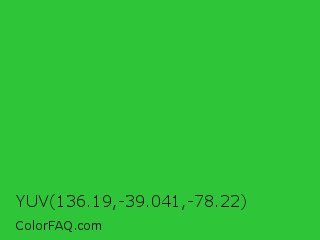 YUV 136.19,-39.041,-78.22 Color is a normal green color and the nearest color is Lime Green #32cd32. Hex code #2fc539 and RGB value is rgb(47,197,57). In RGB color space, this color is composed of 18% red, 77% green, 22% blue, In CMYK color space, this color is composed of 76% cyan, 0% magenta, 71% yellow , 23% black , In HSL color space, this color has a hue angle of 124° , 61% saturation and 48% lightness.