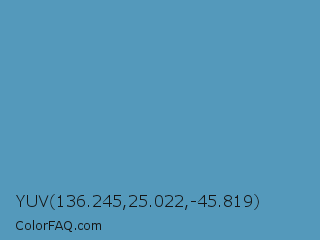 YUV 136.245,25.022,-45.819 Color is a normal blue color and the nearest color is Hippie Blue #589aaf. Hex code #5499bb and RGB value is rgb(84,153,187). In RGB color space, this color is composed of 33% red, 60% green, 73% blue, In CMYK color space, this color is composed of 55% cyan, 18% magenta, 0% yellow , 27% black , In HSL color space, this color has a hue angle of 200° , 43% saturation and 53% lightness.