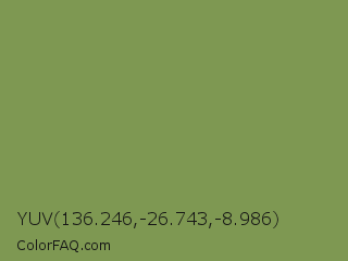 YUV 136.246,-26.743,-8.986 Color is a normal green color and the nearest color is Asparagus Green #7ba05b. Hex code #7e9852 and RGB value is rgb(126,152,82). In RGB color space, this color is composed of 49% red, 60% green, 32% blue, In CMYK color space, this color is composed of 17% cyan, 0% magenta, 46% yellow , 40% black , In HSL color space, this color has a hue angle of 82° , 30% saturation and 46% lightness.