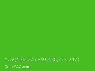 YUV 136.276,-49.436,-57.247 Color is a normal green color and the nearest color is Kelly Green #4cbb17. Hex code #47bd24 and RGB value is rgb(71,189,36). In RGB color space, this color is composed of 28% red, 74% green, 14% blue, In CMYK color space, this color is composed of 62% cyan, 0% magenta, 81% yellow , 26% black , In HSL color space, this color has a hue angle of 106° , 68% saturation and 44% lightness.
