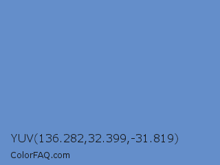 YUV 136.282,32.399,-31.819 Color is a normal blue color and the nearest color is Danube #6093d1. Hex code #648eca and RGB value is rgb(100,142,202). In RGB color space, this color is composed of 39% red, 56% green, 79% blue, In CMYK color space, this color is composed of 50% cyan, 30% magenta, 0% yellow , 21% black , In HSL color space, this color has a hue angle of 215° , 49% saturation and 59% lightness.