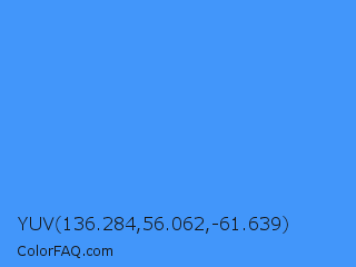 YUV 136.284,56.062,-61.639 Color is a light blue color and the nearest color is Brilliant Azure #3399ff. Hex code #4296fa and RGB value is rgb(66,150,250). In RGB color space, this color is composed of 26% red, 59% green, 98% blue, In CMYK color space, this color is composed of 74% cyan, 40% magenta, 0% yellow , 2% black , In HSL color space, this color has a hue angle of 213° , 95% saturation and 62% lightness.