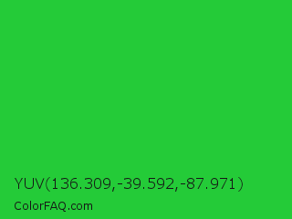 YUV 136.309,-39.592,-87.971 Color is a normal green color and the nearest color is Lime Green #32cd32. Hex code #24cb38 and RGB value is rgb(36,203,56). In RGB color space, this color is composed of 14% red, 80% green, 22% blue, In CMYK color space, this color is composed of 82% cyan, 0% magenta, 72% yellow , 20% black , In HSL color space, this color has a hue angle of 127° , 70% saturation and 47% lightness.