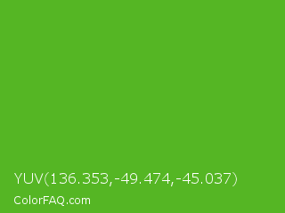 YUV 136.353,-49.474,-45.037 Color is a normal green color and the nearest color is Kelly Green #4cbb17. Hex code #55b624 and RGB value is rgb(85,182,36). In RGB color space, this color is composed of 33% red, 71% green, 14% blue, In CMYK color space, this color is composed of 53% cyan, 0% magenta, 80% yellow , 29% black , In HSL color space, this color has a hue angle of 100° , 67% saturation and 43% lightness.