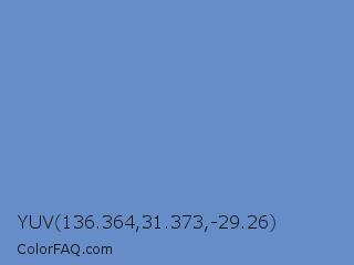 YUV 136.364,31.373,-29.26 Color is a normal blue color and the nearest color is Blue Gray #6699cc. Hex code #678dc8 and RGB value is rgb(103,141,200). In RGB color space, this color is composed of 40% red, 55% green, 78% blue, In CMYK color space, this color is composed of 49% cyan, 30% magenta, 0% yellow , 22% black , In HSL color space, this color has a hue angle of 216° , 47% saturation and 59% lightness.
