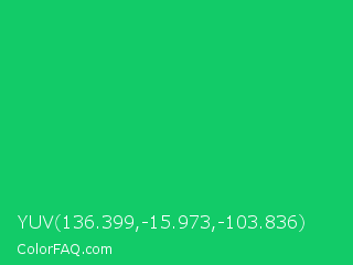 YUV 136.399,-15.973,-103.836 Color is a normal green color and the nearest color is Malachite #0bda51. Hex code #12cb68 and RGB value is rgb(18,203,104). In RGB color space, this color is composed of 7% red, 80% green, 41% blue, In CMYK color space, this color is composed of 91% cyan, 0% magenta, 49% yellow , 20% black , In HSL color space, this color has a hue angle of 148° , 84% saturation and 43% lightness.