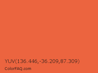 YUV 136.446,-36.209,87.309 Color is a normal red color and the nearest color is Orange Soda #fa5b3d. Hex code #ec643f and RGB value is rgb(236,100,63). In RGB color space, this color is composed of 93% red, 39% green, 25% blue, In CMYK color space, this color is composed of 0% cyan, 58% magenta, 73% yellow , 7% black , In HSL color space, this color has a hue angle of 13° , 82% saturation and 59% lightness.