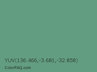 YUV 136.466,-3.681,-32.858 Color is a normal green color and the nearest color is Shiny Shamrock #5fa778. Hex code #639d81 and RGB value is rgb(99,157,129). In RGB color space, this color is composed of 39% red, 62% green, 51% blue, In CMYK color space, this color is composed of 37% cyan, 0% magenta, 18% yellow , 38% black , In HSL color space, this color has a hue angle of 151° , 23% saturation and 50% lightness.