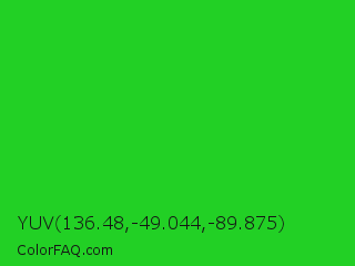 YUV 136.48,-49.044,-89.875 Color is a normal green color and the nearest color is Lime Green #32cd32. Hex code #22d025 and RGB value is rgb(34,208,37). In RGB color space, this color is composed of 13% red, 82% green, 15% blue, In CMYK color space, this color is composed of 84% cyan, 0% magenta, 82% yellow , 18% black , In HSL color space, this color has a hue angle of 121° , 72% saturation and 47% lightness.