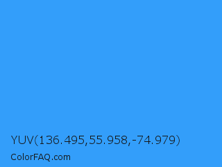 YUV 136.495,55.958,-74.979 Color is a normal blue color and the nearest color is Brilliant Azure #3399ff. Hex code #339efa and RGB value is rgb(51,158,250). In RGB color space, this color is composed of 20% red, 62% green, 98% blue, In CMYK color space, this color is composed of 80% cyan, 37% magenta, 0% yellow , 2% black , In HSL color space, this color has a hue angle of 208° , 95% saturation and 59% lightness.