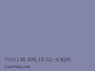 YUV 136.506,16.02,-4.829 Color is a normal blue color and the nearest color is Shadow Blue #778ba5. Hex code #8385a9 and RGB value is rgb(131,133,169). In RGB color space, this color is composed of 51% red, 52% green, 66% blue, In CMYK color space, this color is composed of 22% cyan, 21% magenta, 0% yellow , 34% black , In HSL color space, this color has a hue angle of 237° , 18% saturation and 59% lightness.