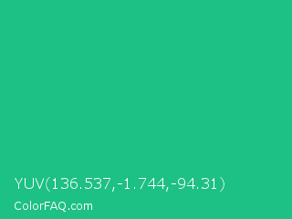 YUV 136.537,-1.744,-94.31 Color is a normal green color and the nearest color is Mountain Meadow Crayola #1ab385. Hex code #1dc085 and RGB value is rgb(29,192,133). In RGB color space, this color is composed of 11% red, 75% green, 52% blue, In CMYK color space, this color is composed of 85% cyan, 0% magenta, 31% yellow , 25% black , In HSL color space, this color has a hue angle of 158° , 74% saturation and 43% lightness.