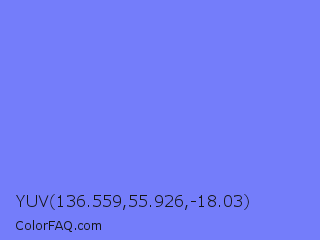 YUV 136.559,55.926,-18.03 Color is a light blue color and the nearest color is Medium Slate Blue #7b68ee. Hex code #747dfa and RGB value is rgb(116,125,250). In RGB color space, this color is composed of 45% red, 49% green, 98% blue, In CMYK color space, this color is composed of 54% cyan, 50% magenta, 0% yellow , 2% black , In HSL color space, this color has a hue angle of 236° , 93% saturation and 72% lightness.