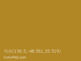 YUV 136.5,-48.561,35.519 Color is a normal orange color and the nearest color is University Of California Gold #b78727. Hex code #b18726 and RGB value is rgb(177,135,38). In RGB color space, this color is composed of 69% red, 53% green, 15% blue, In CMYK color space, this color is composed of 0% cyan, 24% magenta, 79% yellow , 31% black , In HSL color space, this color has a hue angle of 42° , 65% saturation and 42% lightness.