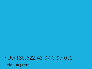 YUV 136.622,43.077,-97.015 Color is a normal blue color and the nearest color is Battery Charged Blue #1dacd6. Hex code #1ab0e0 and RGB value is rgb(26,176,224). In RGB color space, this color is composed of 10% red, 69% green, 88% blue, In CMYK color space, this color is composed of 88% cyan, 21% magenta, 0% yellow , 12% black , In HSL color space, this color has a hue angle of 195° , 79% saturation and 49% lightness.