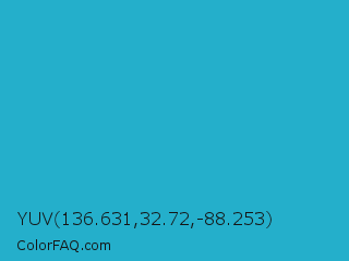 YUV 136.631,32.72,-88.253 Color is a normal cyan color and the nearest color is Ball Blue #21abcd. Hex code #24afcb and RGB value is rgb(36,175,203). In RGB color space, this color is composed of 14% red, 69% green, 80% blue, In CMYK color space, this color is composed of 82% cyan, 14% magenta, 0% yellow , 20% black , In HSL color space, this color has a hue angle of 190° , 70% saturation and 47% lightness.