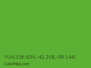 YUV 136.634,-42.218,-39.144 Color is a normal green color and the nearest color is Green RYB #66b032. Hex code #5cb033 and RGB value is rgb(92,176,51). In RGB color space, this color is composed of 36% red, 69% green, 20% blue, In CMYK color space, this color is composed of 48% cyan, 0% magenta, 71% yellow , 31% black , In HSL color space, this color has a hue angle of 100° , 55% saturation and 45% lightness.