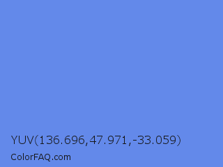 YUV 136.696,47.971,-33.059 Color is a light blue color and the nearest color is Cornflower Blue #6495ed. Hex code #6389ea and RGB value is rgb(99,137,234). In RGB color space, this color is composed of 39% red, 54% green, 92% blue, In CMYK color space, this color is composed of 58% cyan, 41% magenta, 0% yellow , 8% black , In HSL color space, this color has a hue angle of 223° , 76% saturation and 65% lightness.