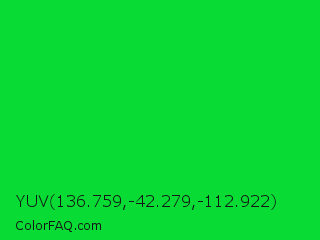 YUV 136.759,-42.279,-112.922 Color is a normal green color and the nearest color is Vivid Malachite #00cc33. Hex code #08db33 and RGB value is rgb(8,219,51). In RGB color space, this color is composed of 3% red, 86% green, 20% blue, In CMYK color space, this color is composed of 96% cyan, 0% magenta, 77% yellow , 14% black , In HSL color space, this color has a hue angle of 132° , 93% saturation and 45% lightness.