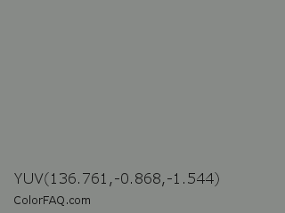 YUV 136.761,-0.868,-1.544 Color is a normal green color and the nearest color is Stack #8a8f8a. Hex code #878a87 and RGB value is rgb(135,138,135). In RGB color space, this color is composed of 53% red, 54% green, 53% blue, In CMYK color space, this color is composed of 2% cyan, 0% magenta, 2% yellow , 46% black , In HSL color space, this color has a hue angle of 120° , 1% saturation and 54% lightness.