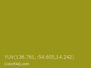 YUV 136.761,-54.605,14.242 Color is a normal yellow color and the nearest color is Citron #9fa91f. Hex code #99961a and RGB value is rgb(153,150,26). In RGB color space, this color is composed of 60% red, 59% green, 10% blue, In CMYK color space, this color is composed of 0% cyan, 2% magenta, 83% yellow , 40% black , In HSL color space, this color has a hue angle of 59° , 71% saturation and 35% lightness.