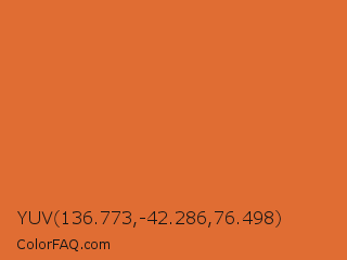 YUV 136.773,-42.286,76.498 Color is a normal orange color and the nearest color is Deep Carrot Orange #e9692c. Hex code #e06d33 and RGB value is rgb(224,109,51). In RGB color space, this color is composed of 88% red, 43% green, 20% blue, In CMYK color space, this color is composed of 0% cyan, 51% magenta, 77% yellow , 12% black , In HSL color space, this color has a hue angle of 20° , 74% saturation and 54% lightness.