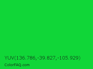YUV 136.786,-39.827,-105.929 Color is a normal green color and the nearest color is Vivid Malachite #00cc33. Hex code #10d638 and RGB value is rgb(16,214,56). In RGB color space, this color is composed of 6% red, 84% green, 22% blue, In CMYK color space, this color is composed of 93% cyan, 0% magenta, 74% yellow , 16% black , In HSL color space, this color has a hue angle of 132° , 86% saturation and 45% lightness.