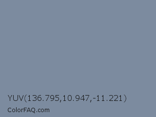 YUV 136.795,10.947,-11.221 Color is a normal blue color and the nearest color is Shadow Blue #778ba5. Hex code #7c8b9f and RGB value is rgb(124,139,159). In RGB color space, this color is composed of 49% red, 55% green, 62% blue, In CMYK color space, this color is composed of 22% cyan, 13% magenta, 0% yellow , 38% black , In HSL color space, this color has a hue angle of 214° , 15% saturation and 55% lightness.