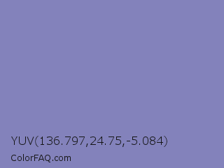 YUV 136.797,24.75,-5.084 Color is a light indigo color and the nearest color is Wild Blue Yonder #7a89b8. Hex code #8382bb and RGB value is rgb(131,130,187). In RGB color space, this color is composed of 51% red, 51% green, 73% blue, In CMYK color space, this color is composed of 30% cyan, 30% magenta, 0% yellow , 27% black , In HSL color space, this color has a hue angle of 241° , 30% saturation and 62% lightness.