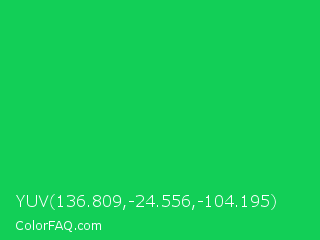 YUV 136.809,-24.556,-104.195 Color is a normal green color and the nearest color is Malachite #0bda51. Hex code #12cf57 and RGB value is rgb(18,207,87). In RGB color space, this color is composed of 7% red, 81% green, 34% blue, In CMYK color space, this color is composed of 91% cyan, 0% magenta, 58% yellow , 19% black , In HSL color space, this color has a hue angle of 142° , 84% saturation and 44% lightness.