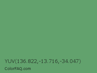 YUV 136.822,-13.716,-34.047 Color is a normal green color and the nearest color is Aqua Forest #5fa777. Hex code #62a26d and RGB value is rgb(98,162,109). In RGB color space, this color is composed of 38% red, 64% green, 43% blue, In CMYK color space, this color is composed of 40% cyan, 0% magenta, 33% yellow , 36% black , In HSL color space, this color has a hue angle of 130° , 26% saturation and 51% lightness.