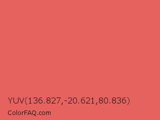 YUV 136.827,-20.621,80.836 Color is a light red color and the nearest color is Roman #de6360. Hex code #e5625f and RGB value is rgb(229,98,95). In RGB color space, this color is composed of 90% red, 38% green, 37% blue, In CMYK color space, this color is composed of 0% cyan, 57% magenta, 59% yellow , 10% black , In HSL color space, this color has a hue angle of 1° , 72% saturation and 64% lightness.
