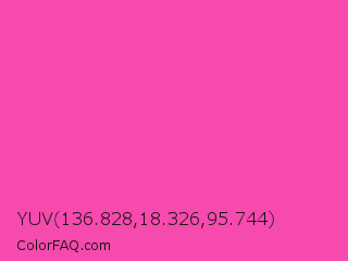 YUV 136.828,18.326,95.744 Color is a light magenta color and the nearest color is Brilliant Rose #f653a6. Hex code #f64aae and RGB value is rgb(246,74,174). In RGB color space, this color is composed of 96% red, 29% green, 68% blue, In CMYK color space, this color is composed of 0% cyan, 70% magenta, 29% yellow , 4% black , In HSL color space, this color has a hue angle of 325° , 91% saturation and 63% lightness.