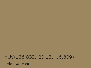 YUV 136.833,-20.131,16.809 Color is a normal orange color and the nearest color is Barley Corn #a68b5b. Hex code #9c8760 and RGB value is rgb(156,135,96). In RGB color space, this color is composed of 61% red, 53% green, 38% blue, In CMYK color space, this color is composed of 0% cyan, 13% magenta, 38% yellow , 39% black , In HSL color space, this color has a hue angle of 39° , 24% saturation and 49% lightness.
